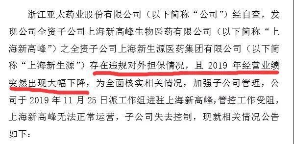 2019年12月25日,媒体曝出浙江亚太药业股份有限公司对旗下上海新高峰生物医药有限公司(以下简称:上海新高峰)及其子公司失去控制,无法接管印章。